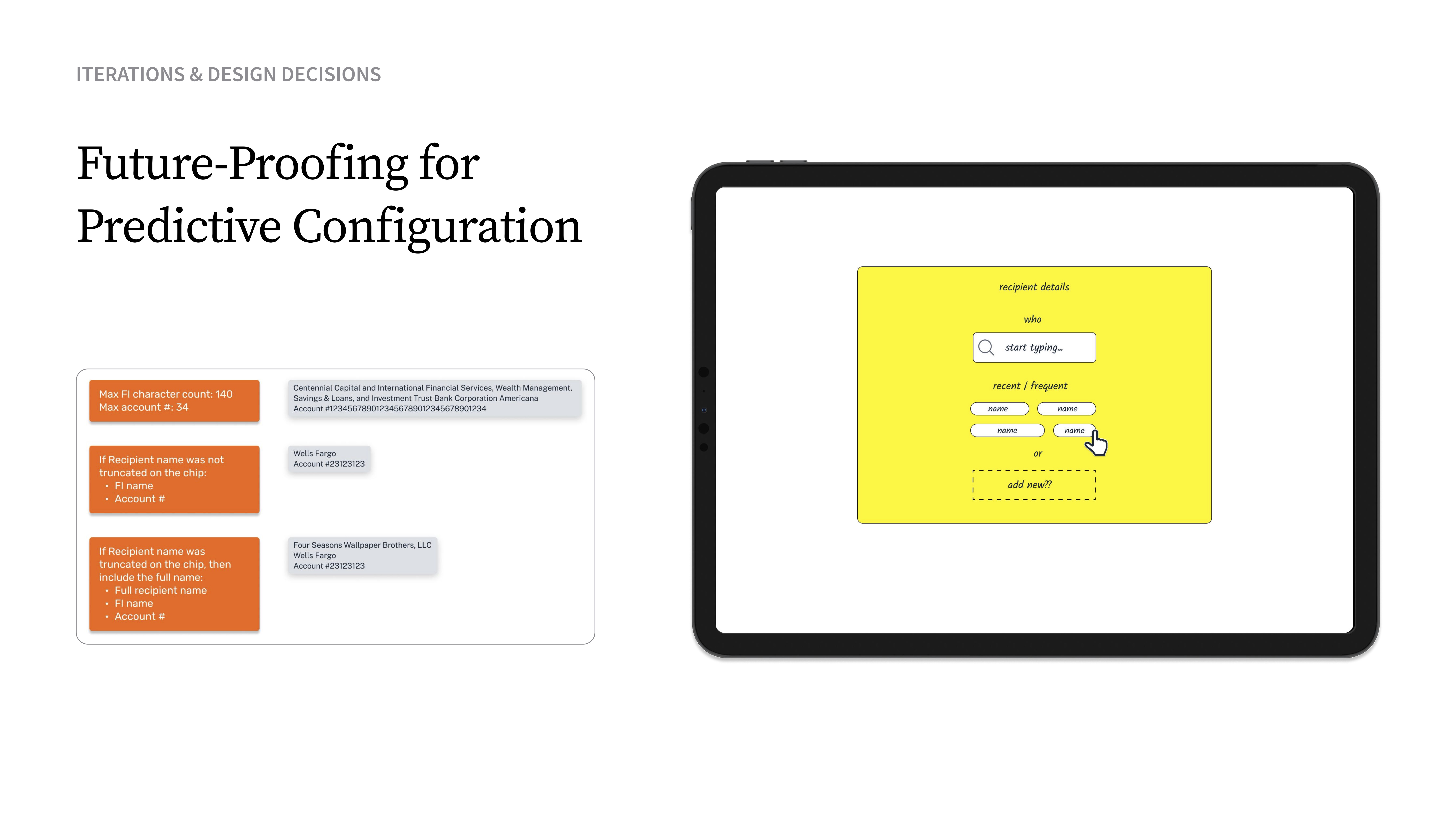 To reduce friction, I introduced a “Recent Payees” pattern that surfaced commonly used recipients as tappable chips—eliminating repetitive dropdown searches and enabling faster, more confident task completion.