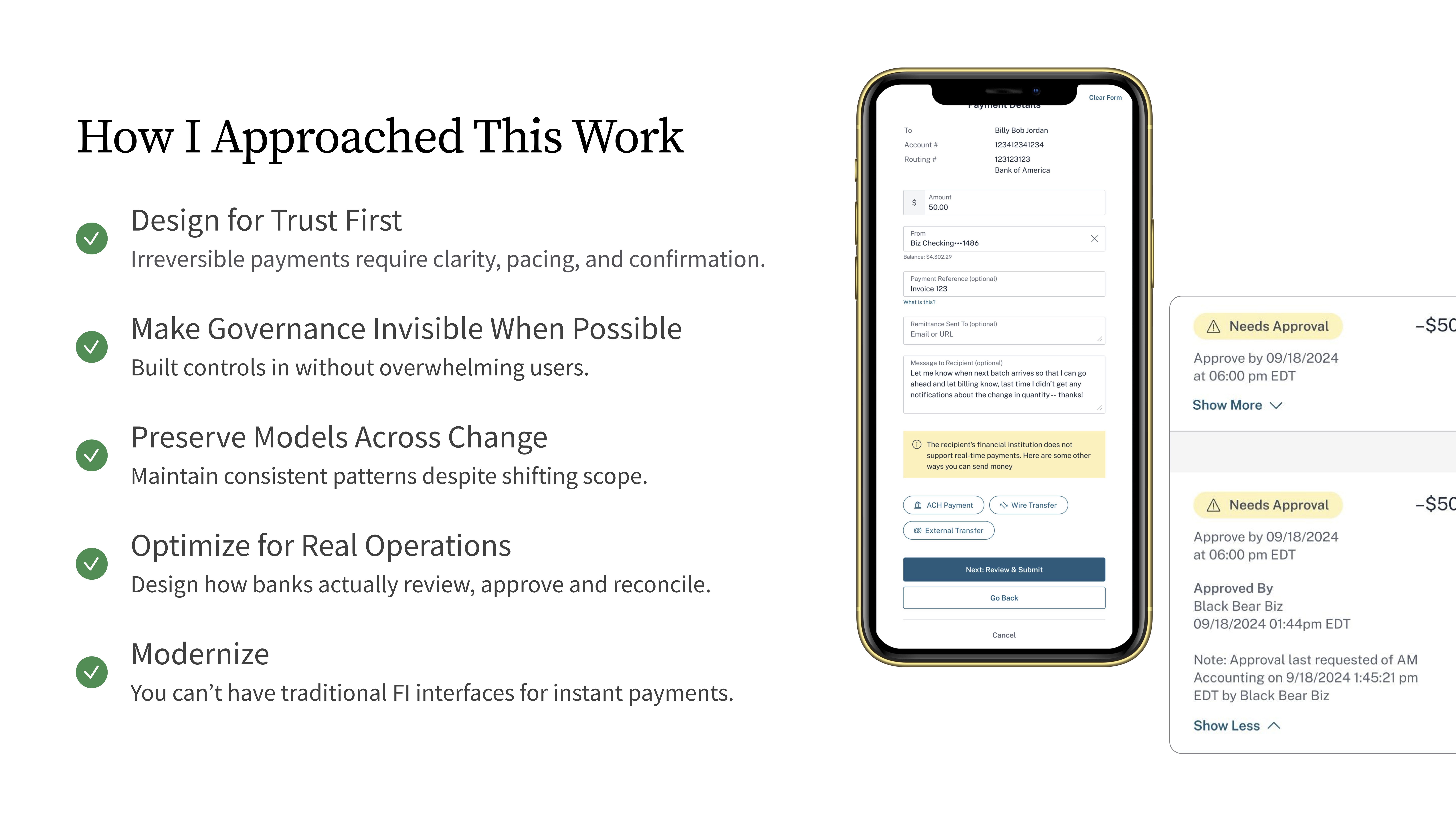 Unlike Wires and ACH, which were constrained by legacy patterns and required incremental improvement, Real-Time Payments (RtP) was a net-new capability— offering the opportunity to design a modern, streamlined experience from the ground up.