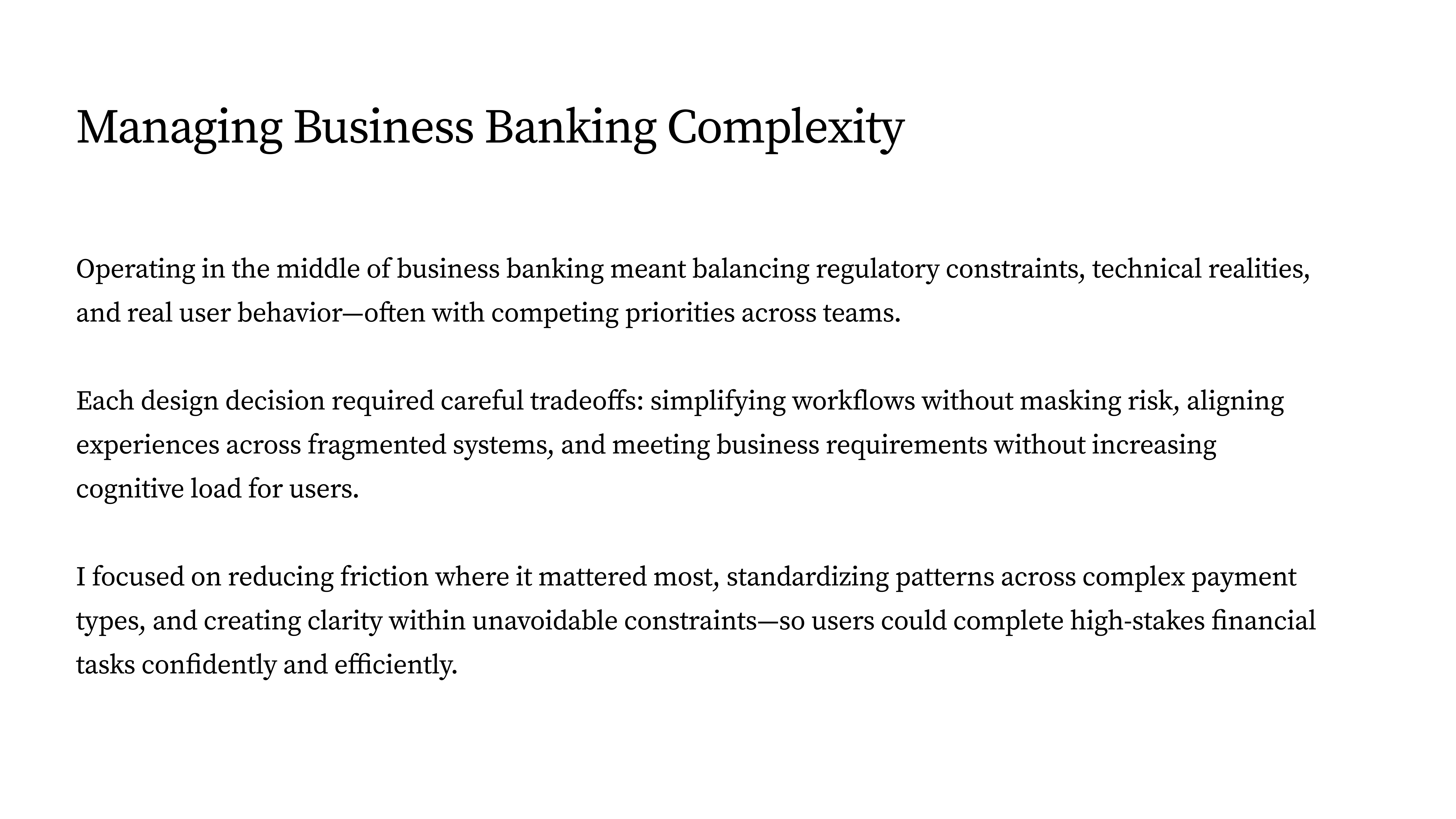 Operating in the middle of business banking meant balancing regulatory constraints, technical realities, and real user behavior—often with competing priorities across teams.